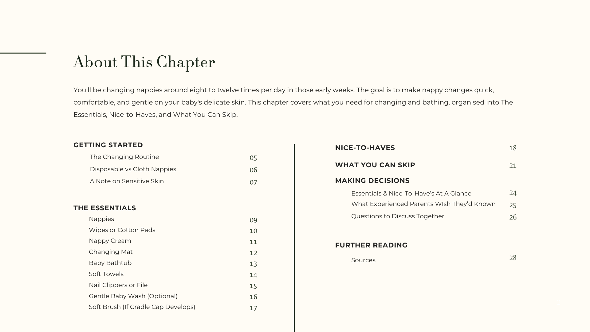 Six chapters. Six areas of daily life with a baby. Instead of one massive list, we organised newborn preparation into clear areas you can work through at your own pace, in whatever order makes sense for you.