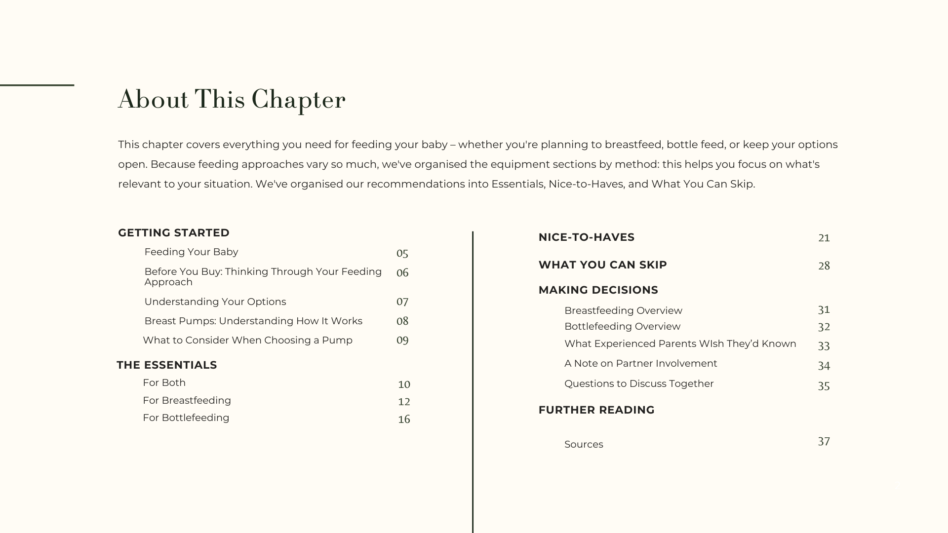 o. This chapter is organised by feeding approach: breastfeeding, bottle-feeding, and combination feeding. For each approach, we cover what you will genuinely need, what is nice to have, and what you can skip. You will understand why certain features matter, so you can make confident decisions in the shop or online.