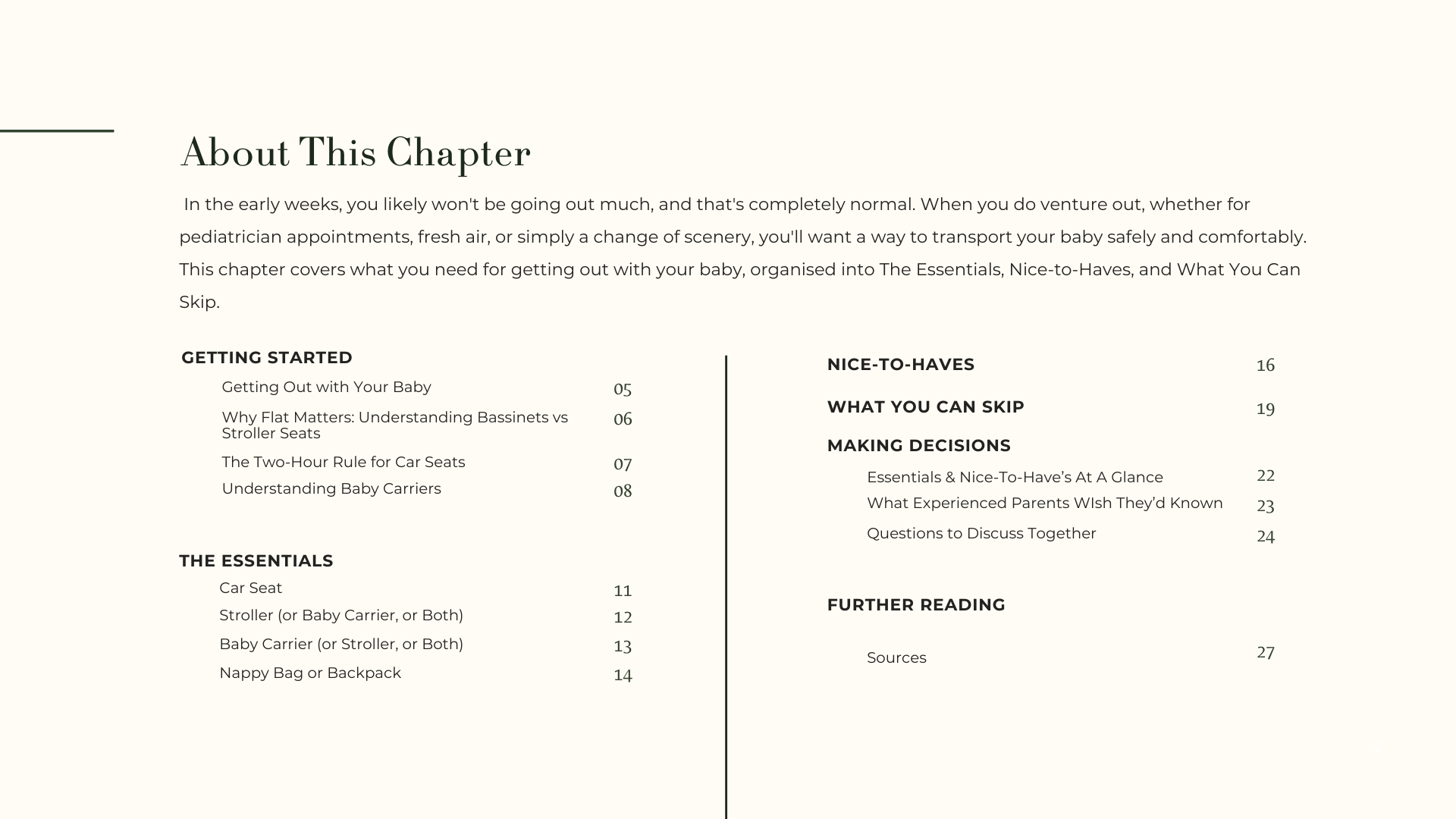 f you've been researching car seats, strollers, and baby carriers, you've probably discovered these are some of the most expensive and confusing baby purchases you'll make. Every brand claims to be the best, features vary enormously, and what works for city parents might be completely wrong for suburban life. This chapter helps you think through what you'll actually need based on how you live.
